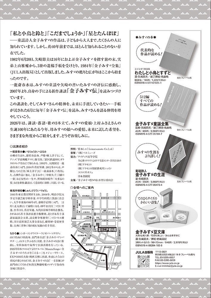 2026年は、講談・落語・歌の3本立て。みすゞの愛娘・上村ふさえさんの生誕100年にあたる今年、母みすゞの娘への愛情、未来に託した希望を、さまざまな角度からご紹介します。どうぞお楽しみに。